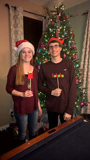 Tonight started our five days of Christmas celebrations. We went over to my sister's house for a night of food, games, gifts and fun. Brandy bought some cute little props that we had fun taking pictures with. Grandma got both families the Pie Face game and that was a big hit with all the kids. It was a great time playing wiht the cousins and of course the kids all loved opening the gifts the best.